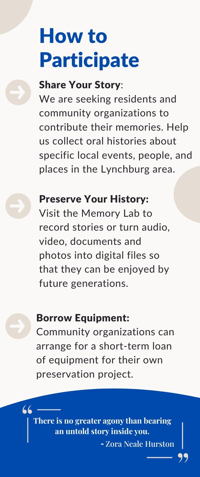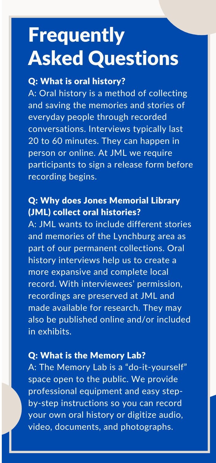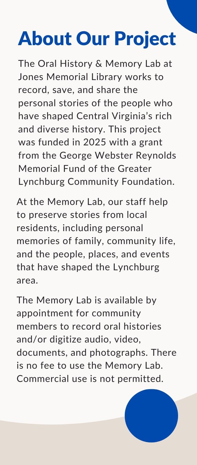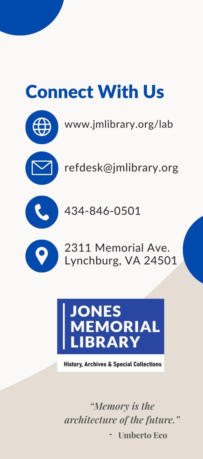 The JML Memory and Digitization Lab is funded by a generous $16,000 grant from the George Webster Reynolds Memorial Fund, a donor advised fund managed by the Greater Lynchburg Community Foundation.